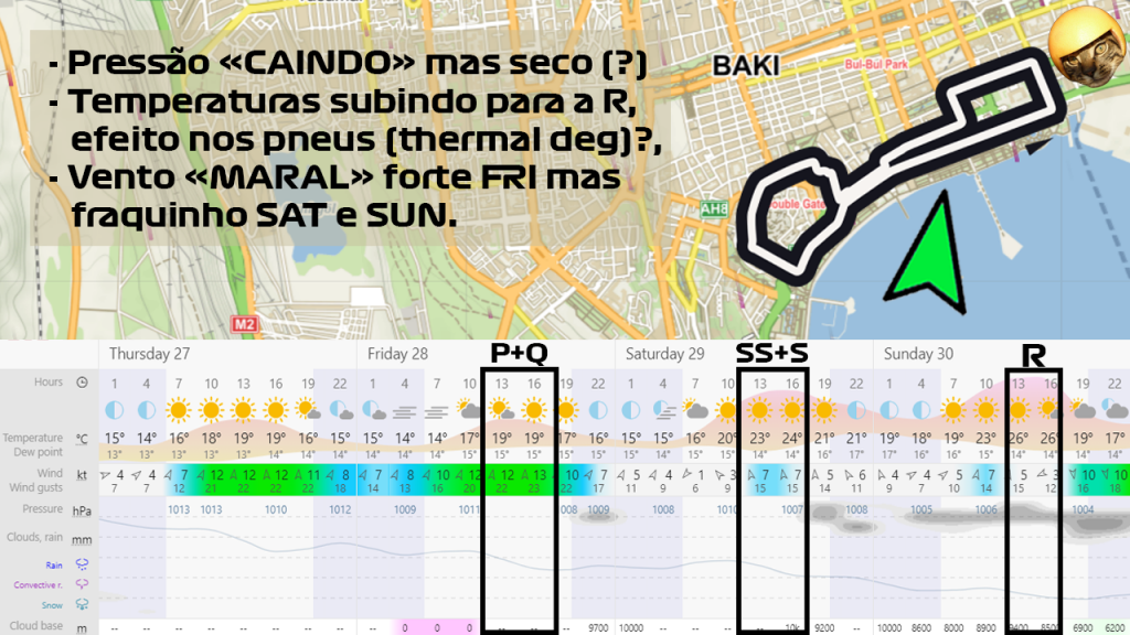 A pressão atmosférica vai despencar durante o final de semana, mas ainda não apareceu nenhuma previsão de chuva. As temperaturas vão subir bastante e isso vai certamente afetar o comportamento dos pneus, entre sexta cedo e domingo a tarde.
