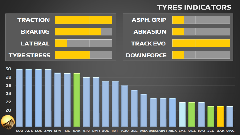 Em termos de pneus, essa corrida é super-abrangente. Por um lado é fácil para a Pirelli escolher as gomas mais macias e também para os estrategistas decidirem por uma unica parada (pouca degradação e alta probabilidade de SC).