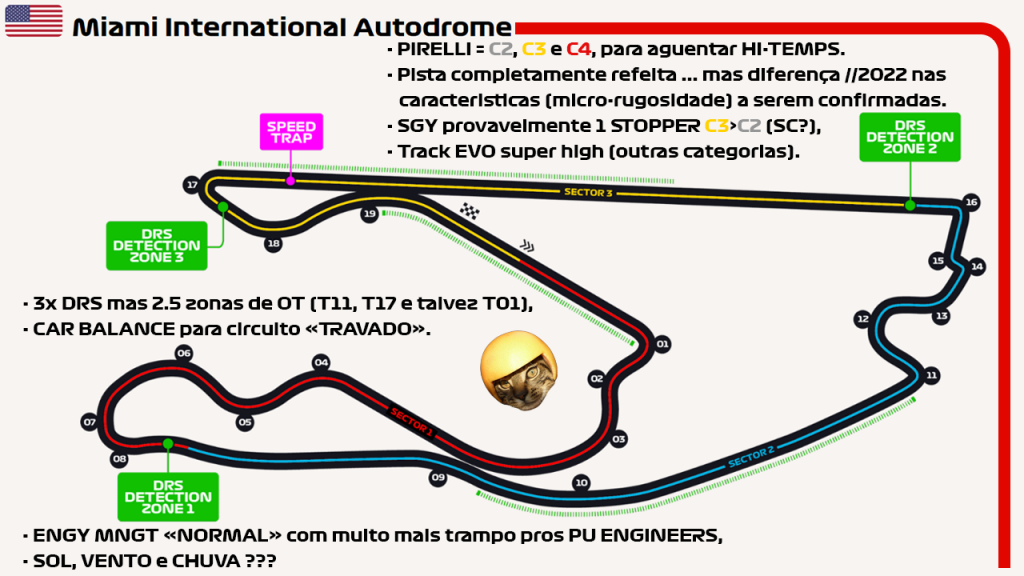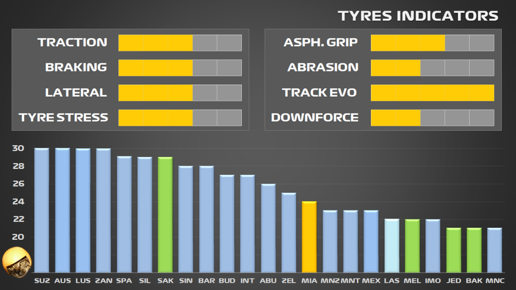 Miami se situa na média-média (isso existe?) dos circuitos. Bem parecido com SAK nesse quesito. Uma unica volta deve ser suficiente para preparar os pneus, mas tudo vai depender do asfalto novo.