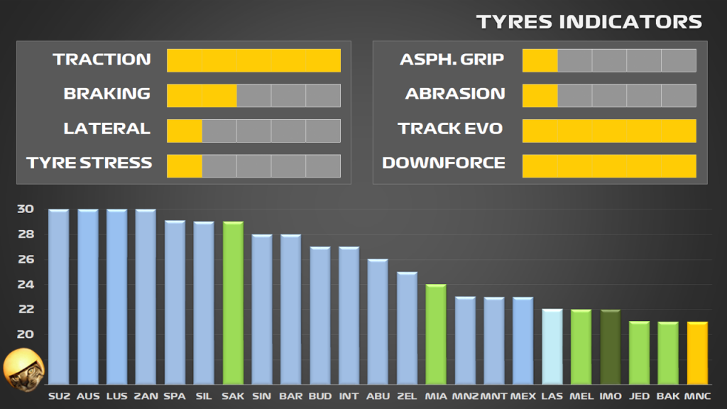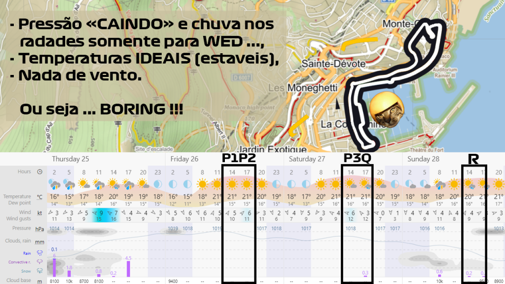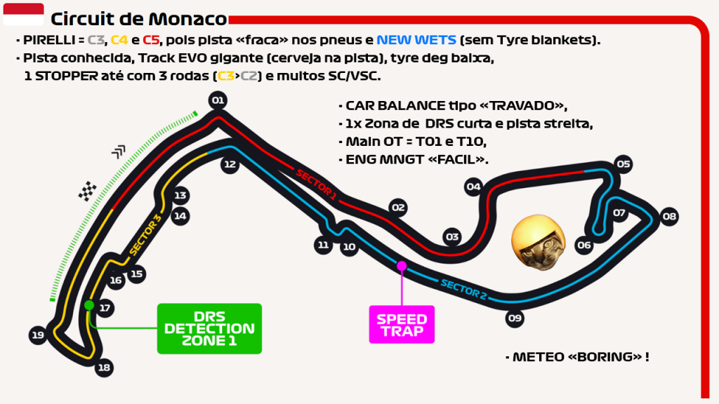 A pista é bem conhecida, tem uma track evolution gigante (efeito da cerveja na Rascasse / T18), degradação super-baixa e uma estratégia UNICA para todos: esperar sair um SC ou um VSC para fazer uma (ou mais) paradas nos boxes.